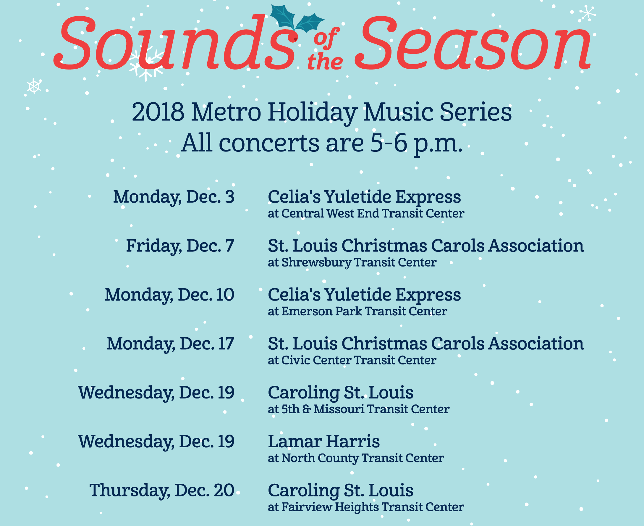 Metro Transit is ringing in the holiday season by featuring music from local caroling groups and musicians at seven Metro Transit Center locations in December.